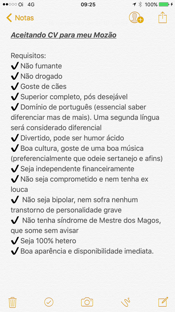 Uma amiga me disse que minhas restrições (minha lista de requisitos para meu crush) podem afastar de quem pode me fazer feliz. Mas aí está justamente o ponto. Essa lista está me mantendo a uma distância de segurança de paixões erradas. Ou quiçá das paixões certas no momento errado.