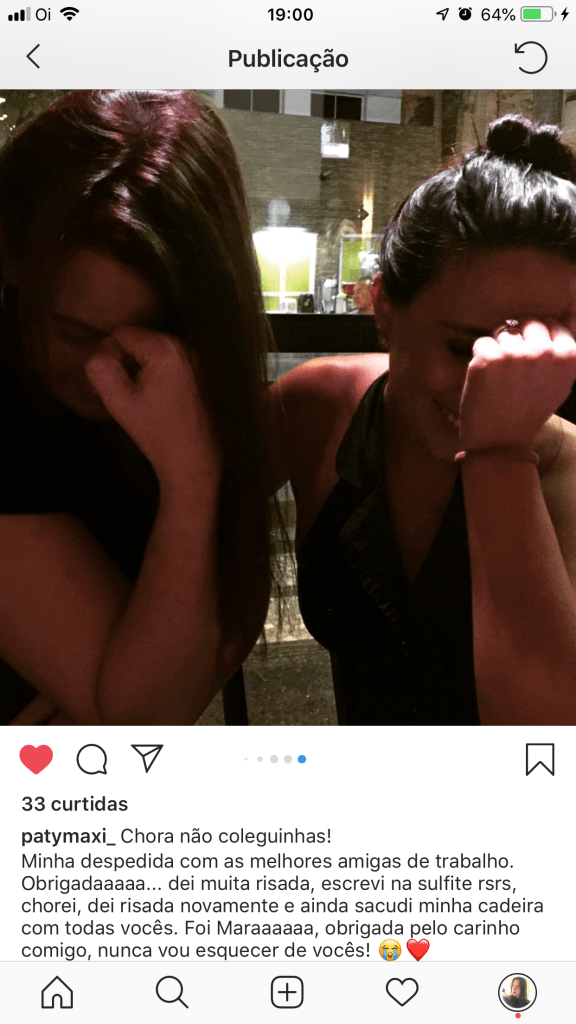 Em 2017 voltei para o Rio e comecei a trabalhar. Logo tive uma oportunidade que se encaixava com o perfil dela (eu não esqueço dos pedidos especiais). Liguei para ela e ofereci. Na época ela estava trabalhando e agradeceu, mas indicou pessoas para a vaga.