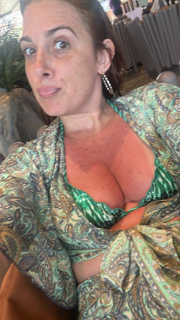Coloquei meu fone, minha meditação e fiquei ali por umas 3 horas. Estava com calça e blusa em cima do biquini. A chuva parou e mesmo com o céu nublado, eu resolvi passar protetor. Quando fui tirar a blusa, a surpresa… eu estava uma mistura de camarão com Hell Boy.