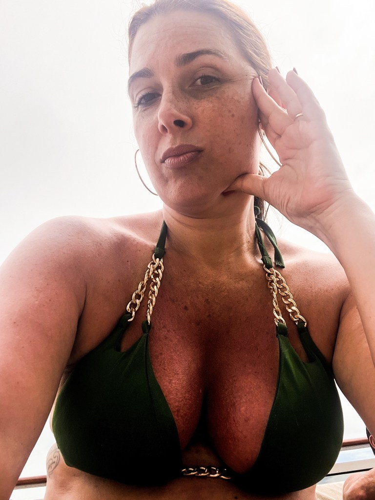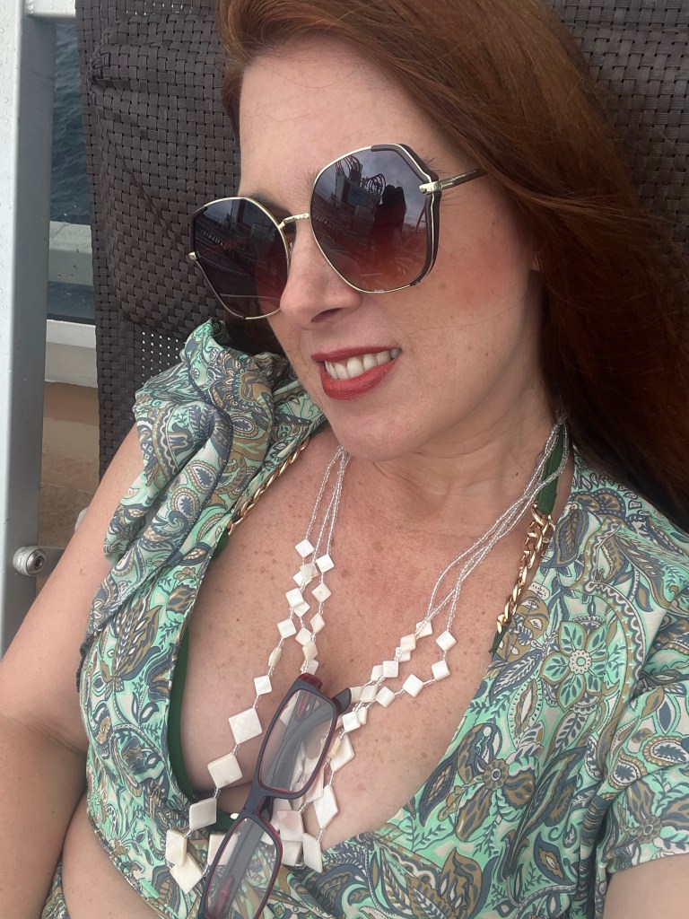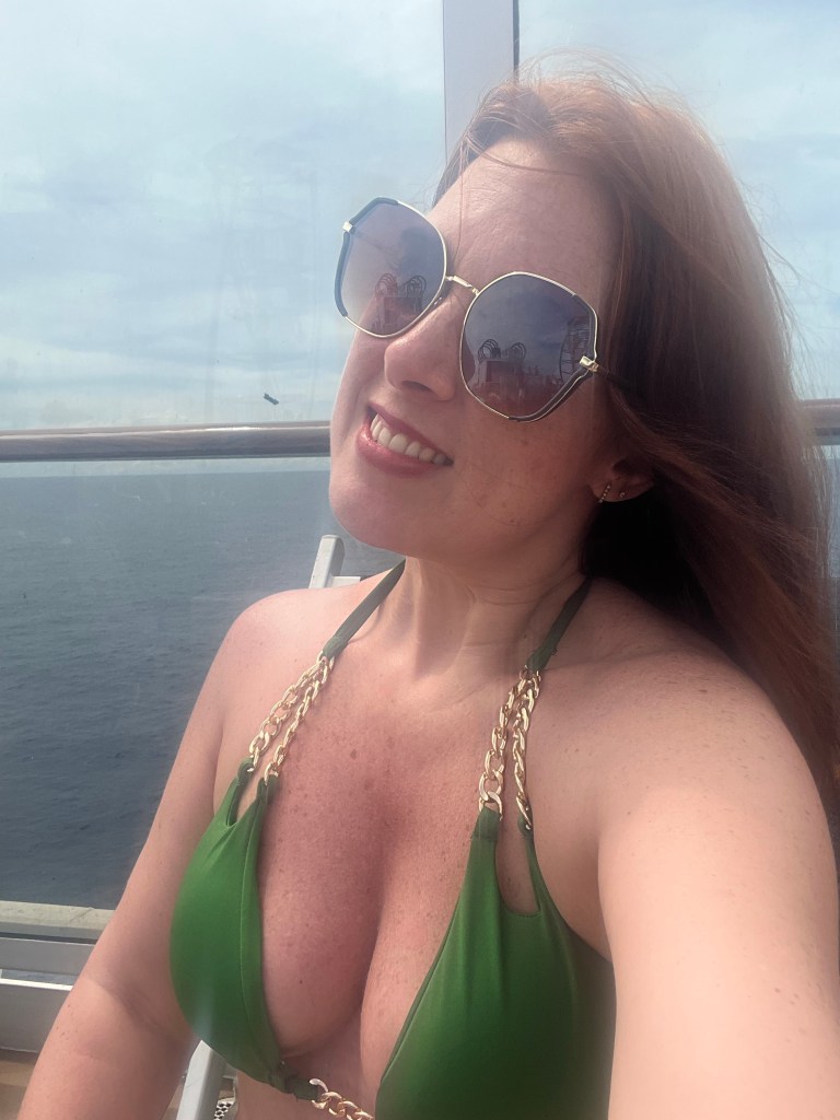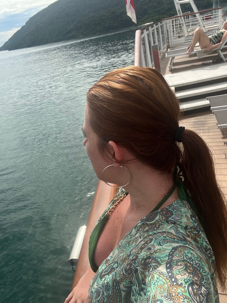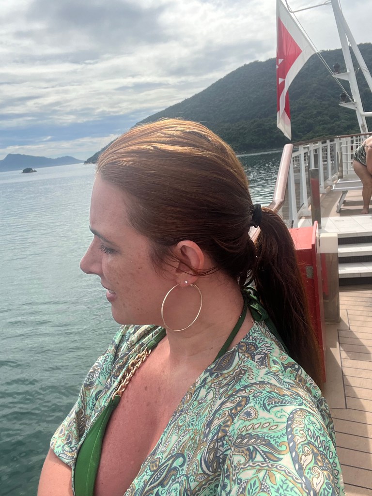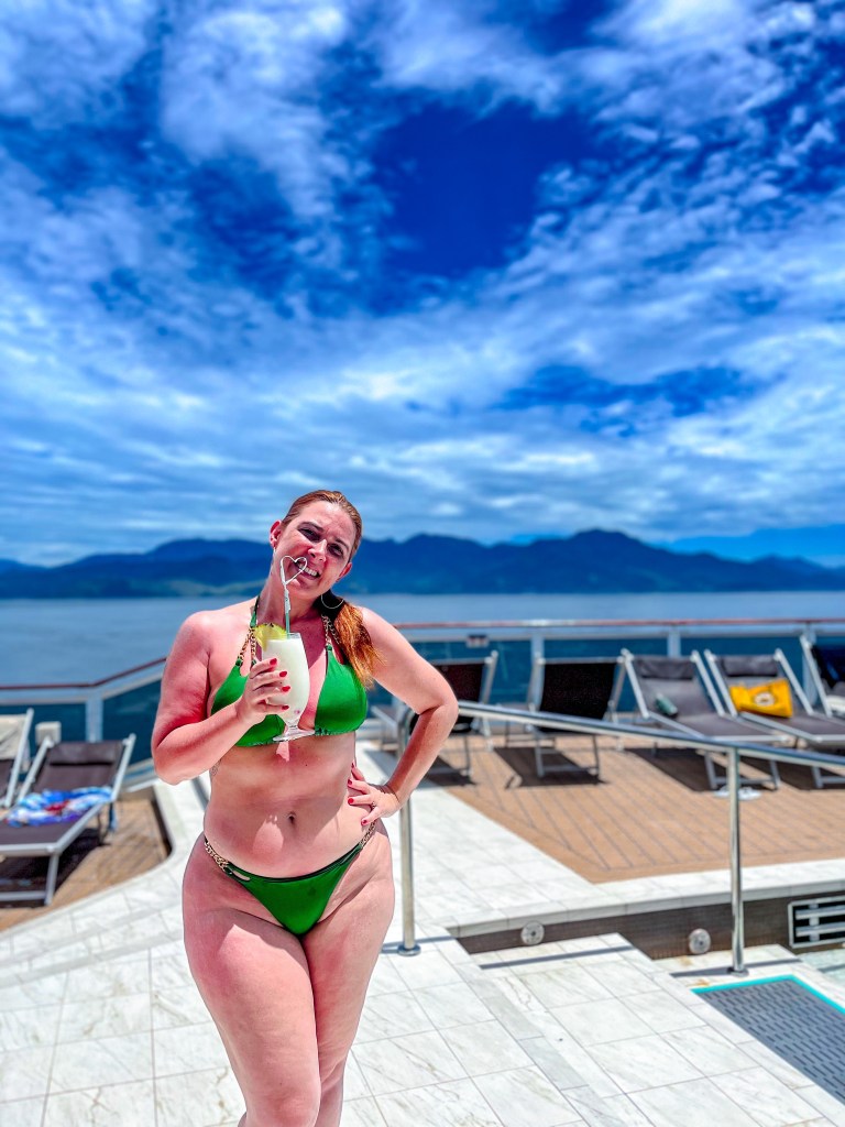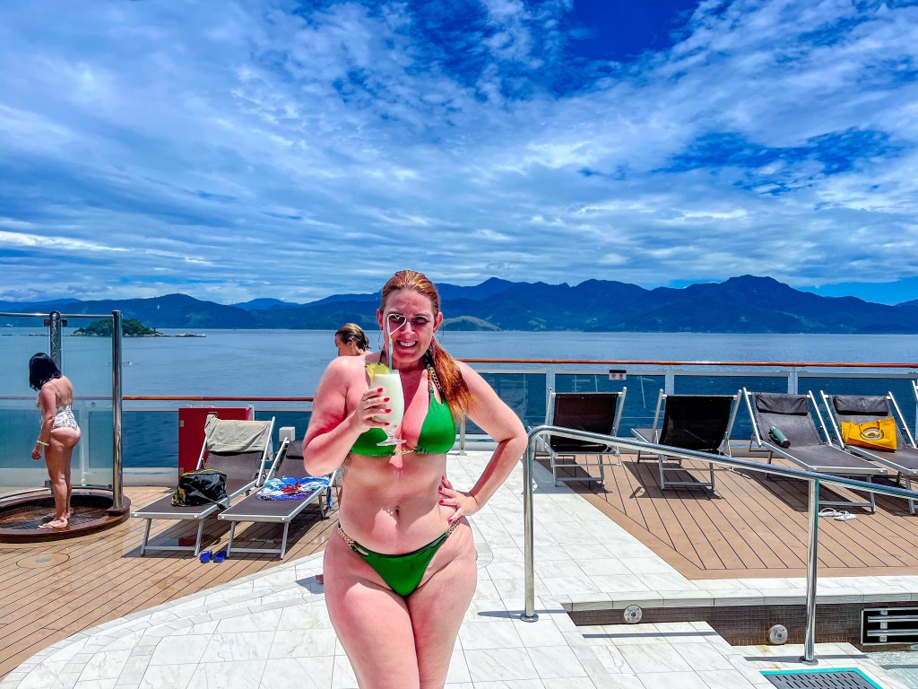 Como o dia depois do embarque é de alto mar e estava chovendo, vocês conseguem imaginar o verdadeiro inferno que as partes internas estavam. Coloquei meu biquini e fui me sentar numa espreguiçadeira na piscina do deck pincipal. O lugar perfeito para eu meditar e não continuar manifestando a vontade de matar o filho da puta que me chamou de tia.